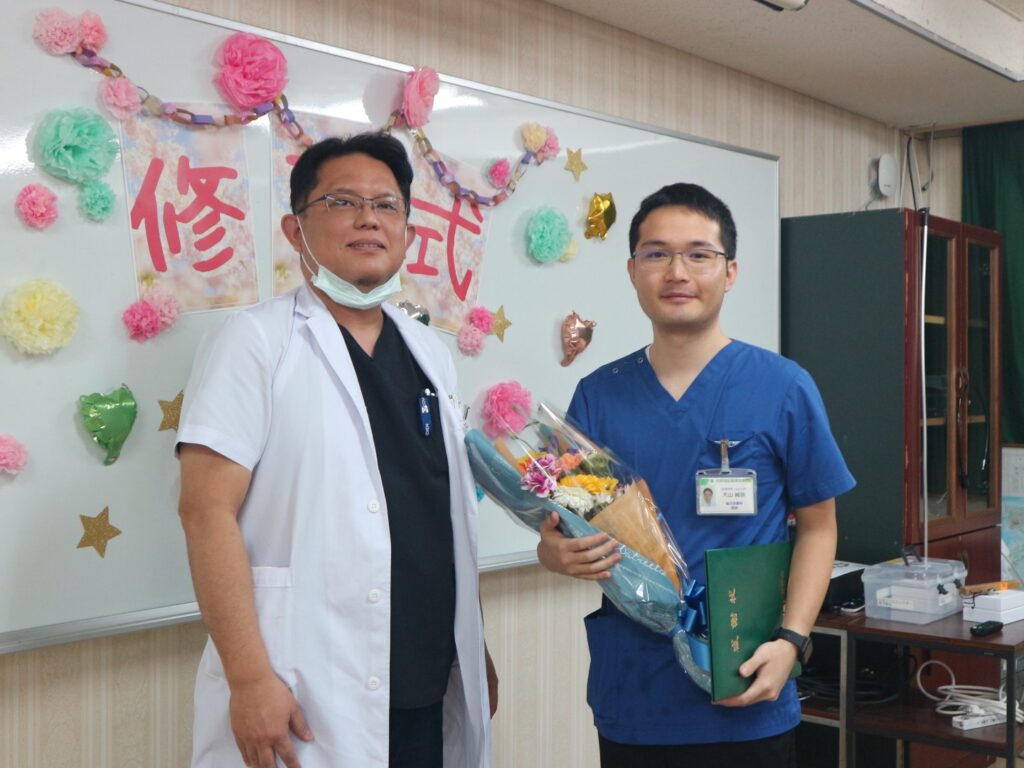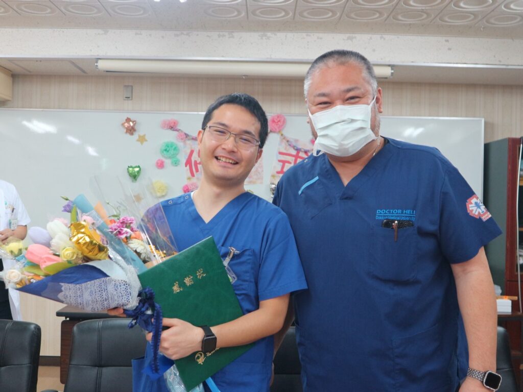 大山研修医からは「この2年間で多くの失敗や間違いも経験しました。その度に、皆さんにはご迷惑をおかけした場面もあったかと思います。反省とともに、そうした経験を糧として、これからも患者さんに最善の医療を提供できるよう、一歩一歩成長していきたいと思います。」と2年間の研修を振り返った想いが述べられました。