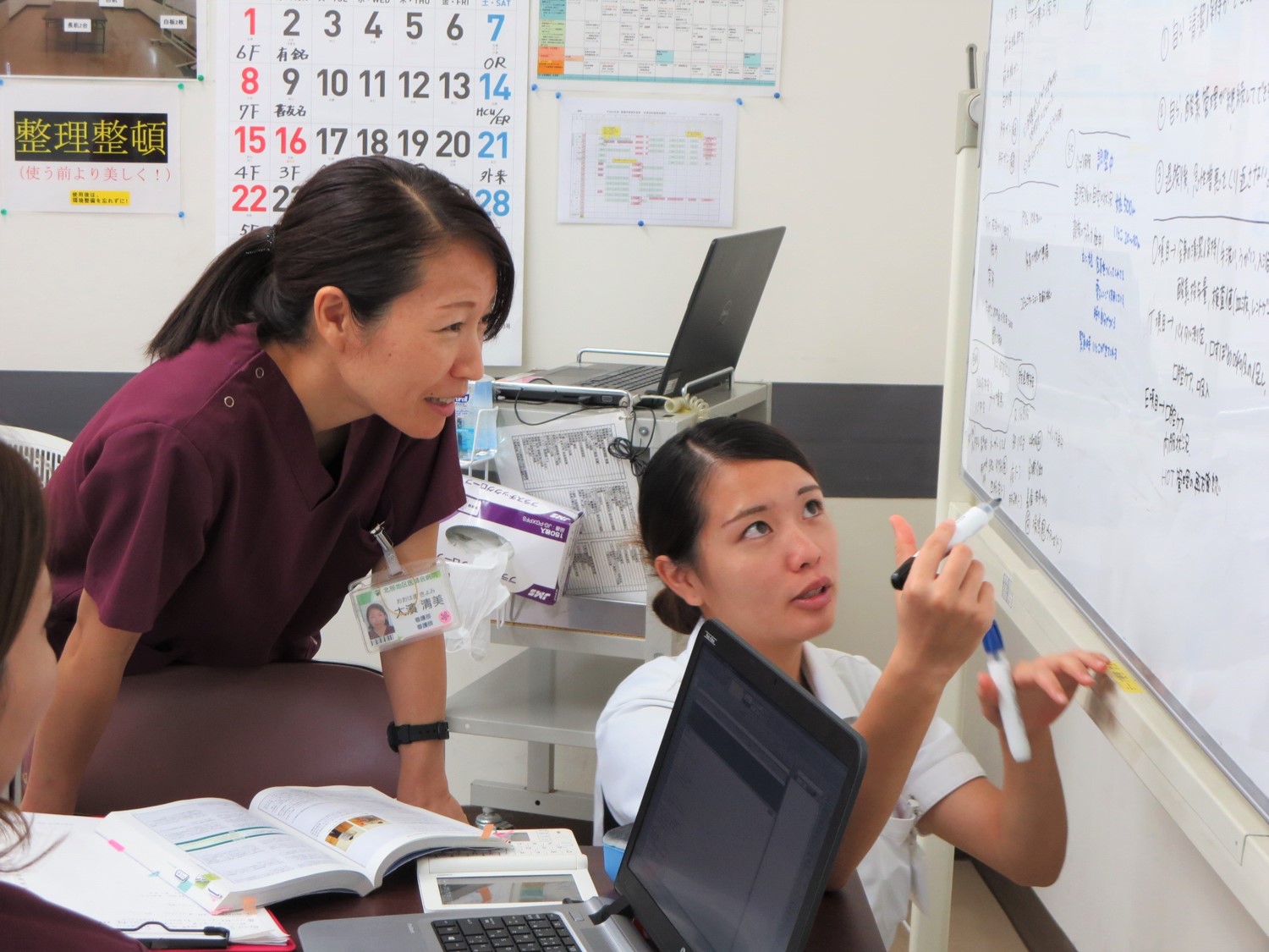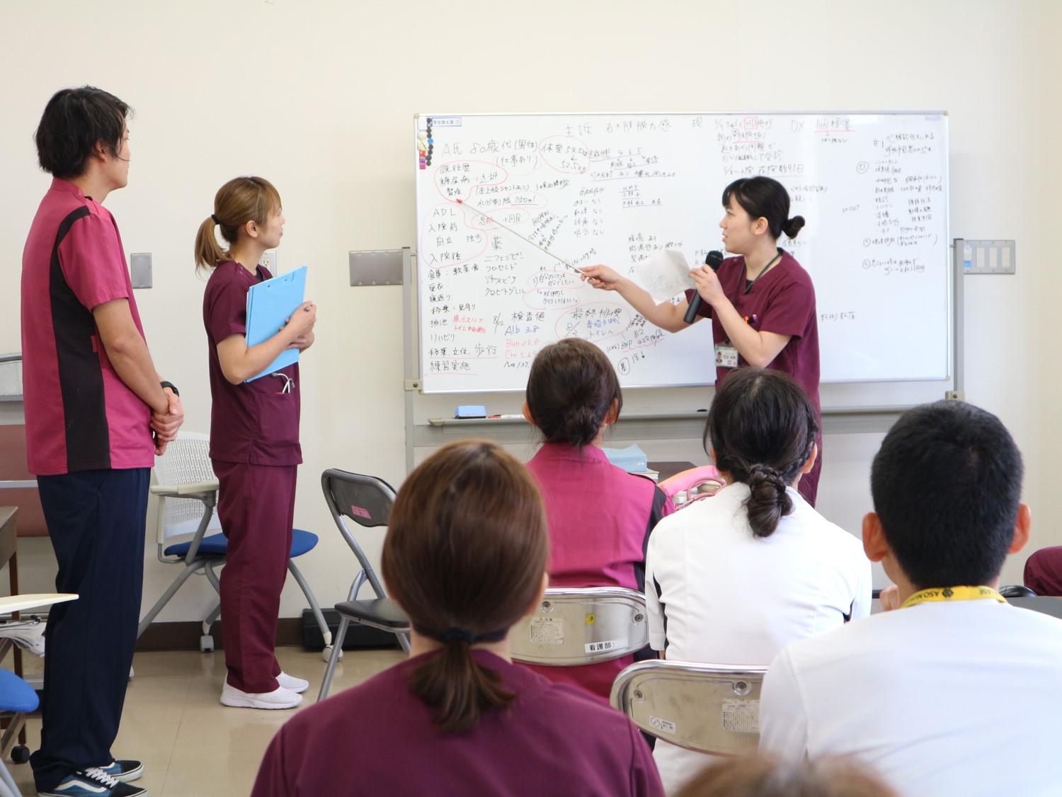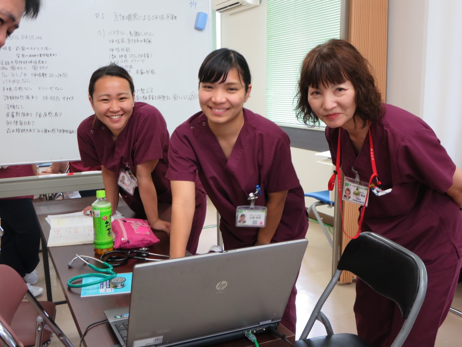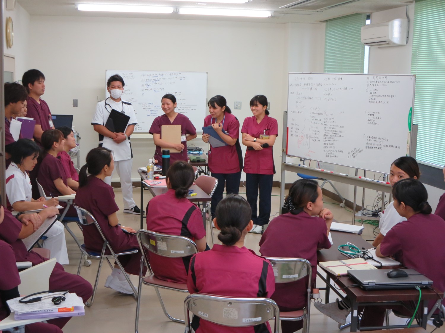 参加者は当院看護師だけではなく、4つの近隣医療機関の看護師を交えた「多施設合同研修」となっています。患者さんの病状をフィジカルアセスメントを用いて系統的に把握し、ケアにつなげることができるという新人看護師のステップアップが目標です。