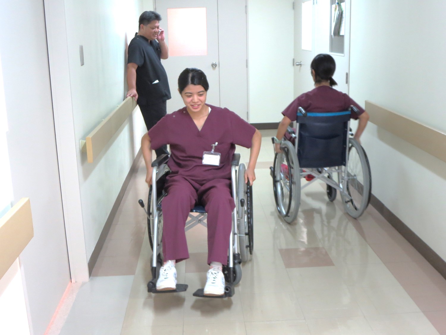 参加者は、午前中には各病棟で入浴・採血・注射の見学、シーツ交換などの体験、午後は血圧測定・車イス・手洗い法・救急蘇生法(BLS)を体験してもらいました。