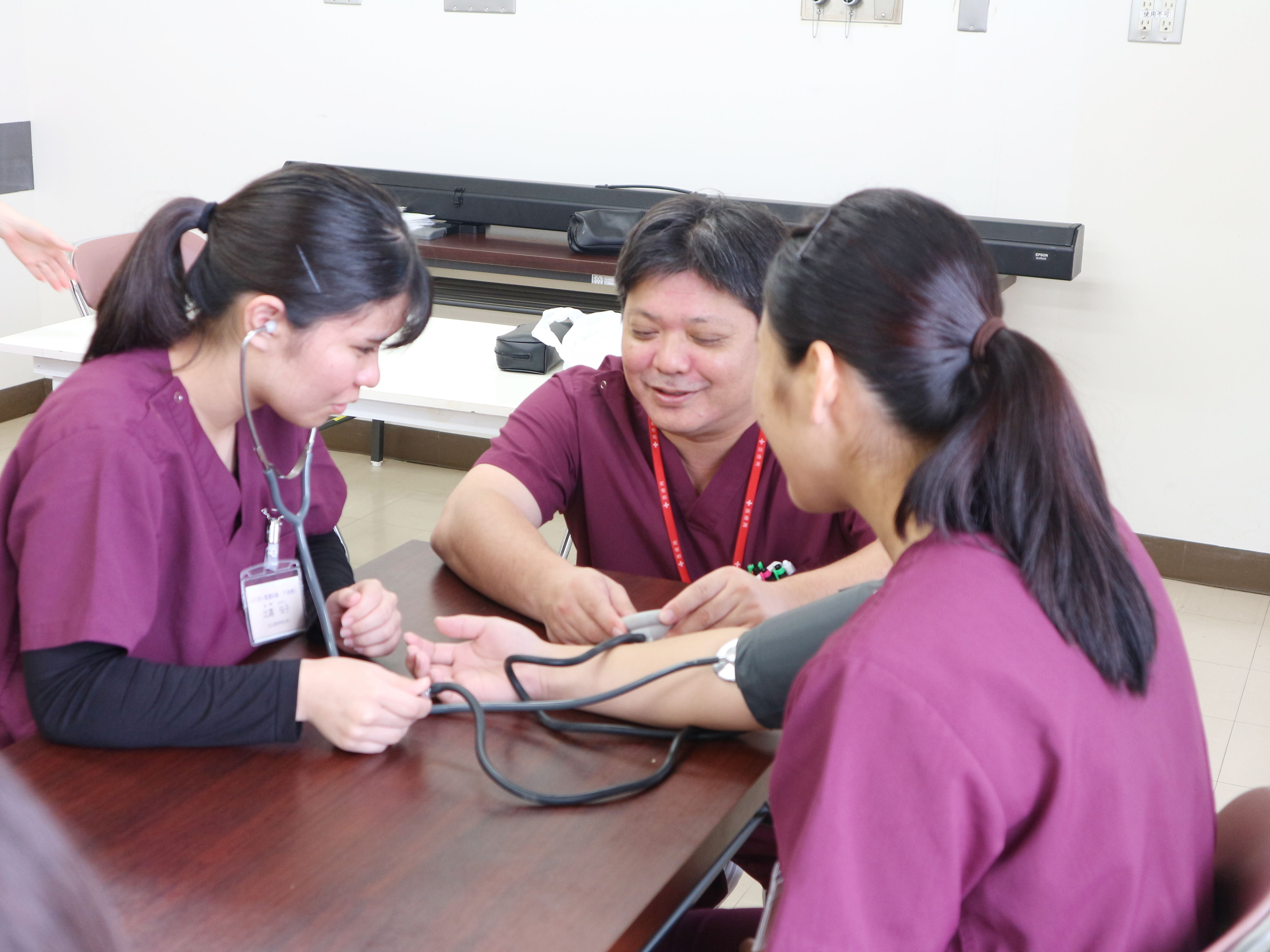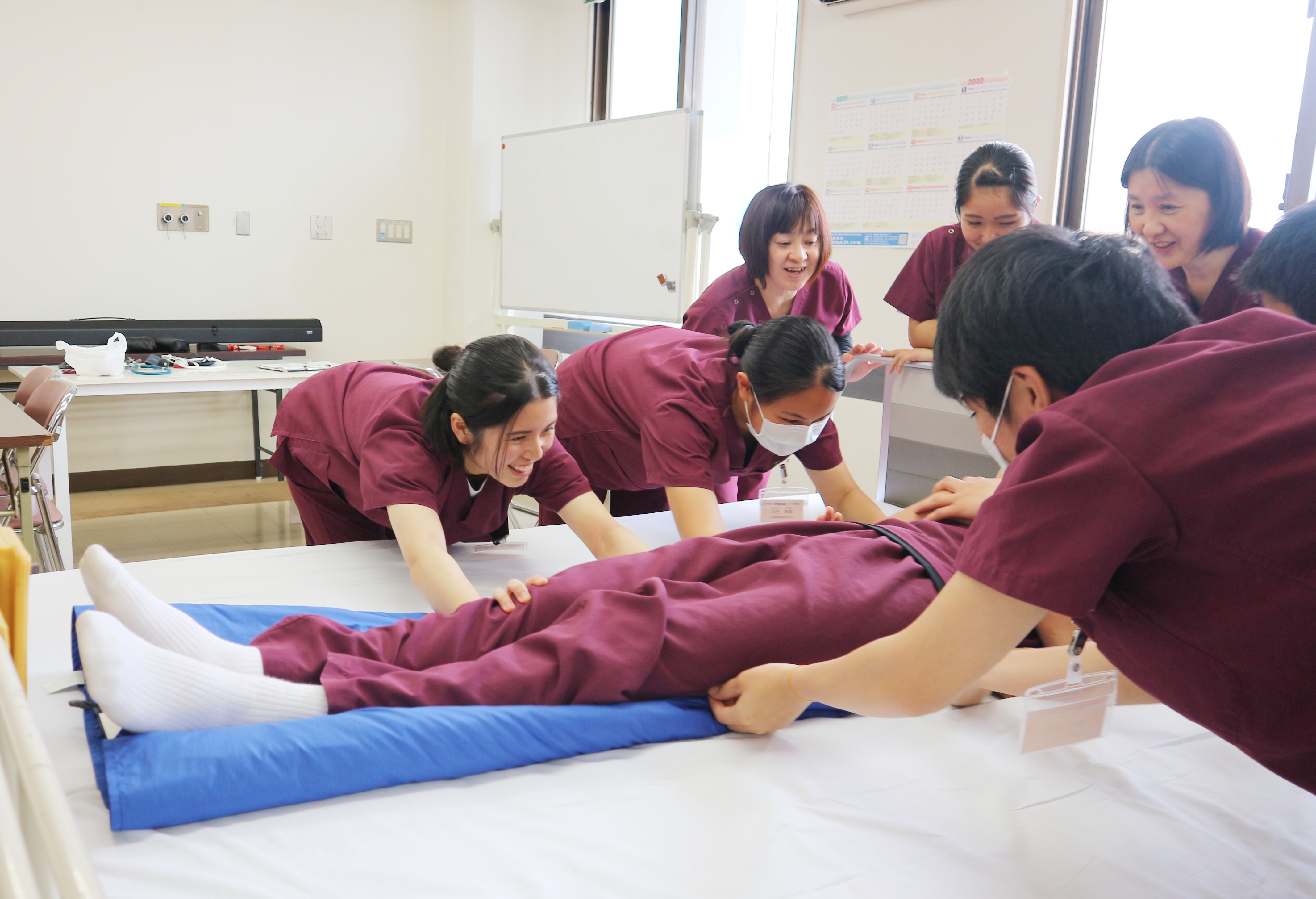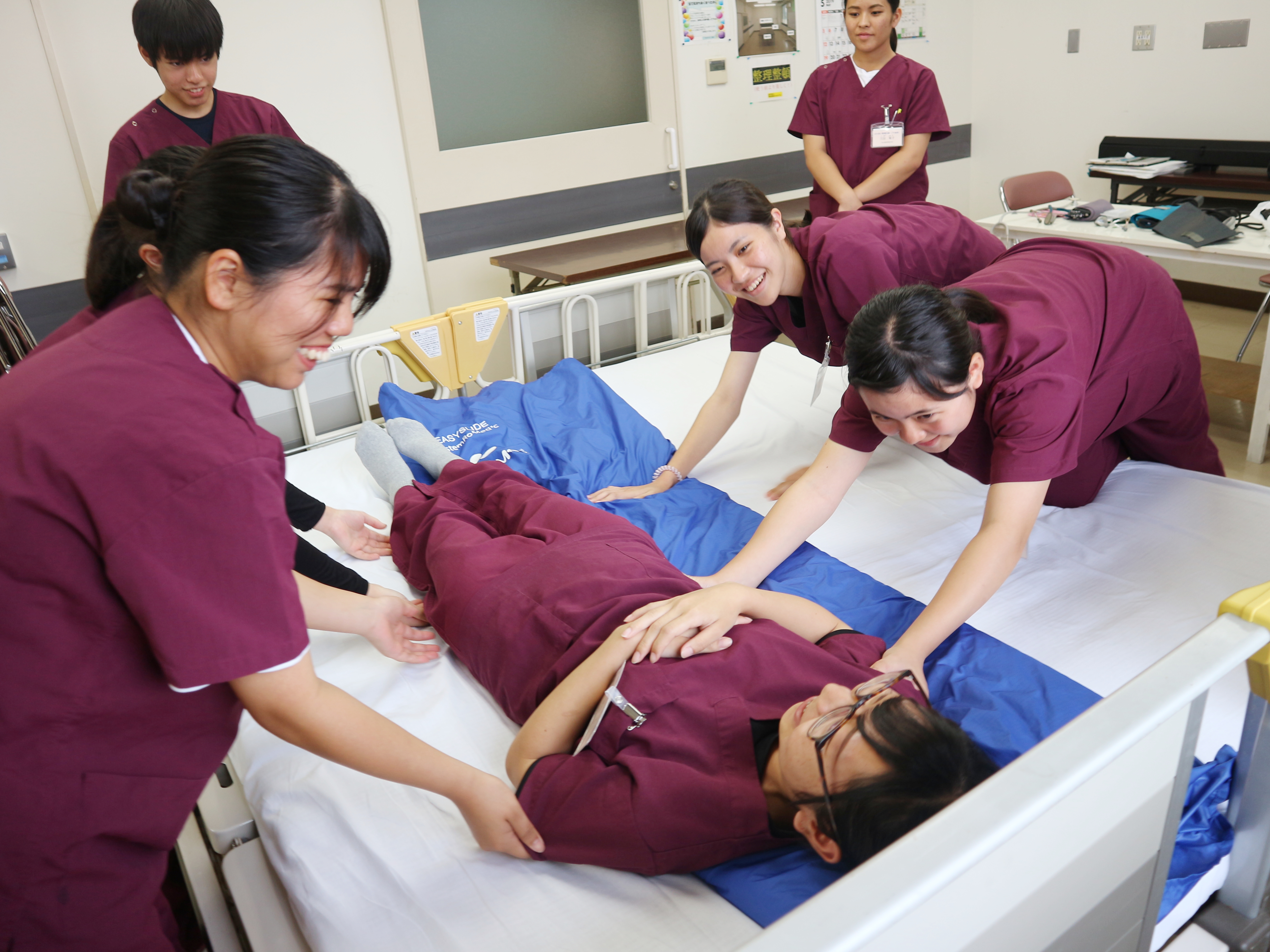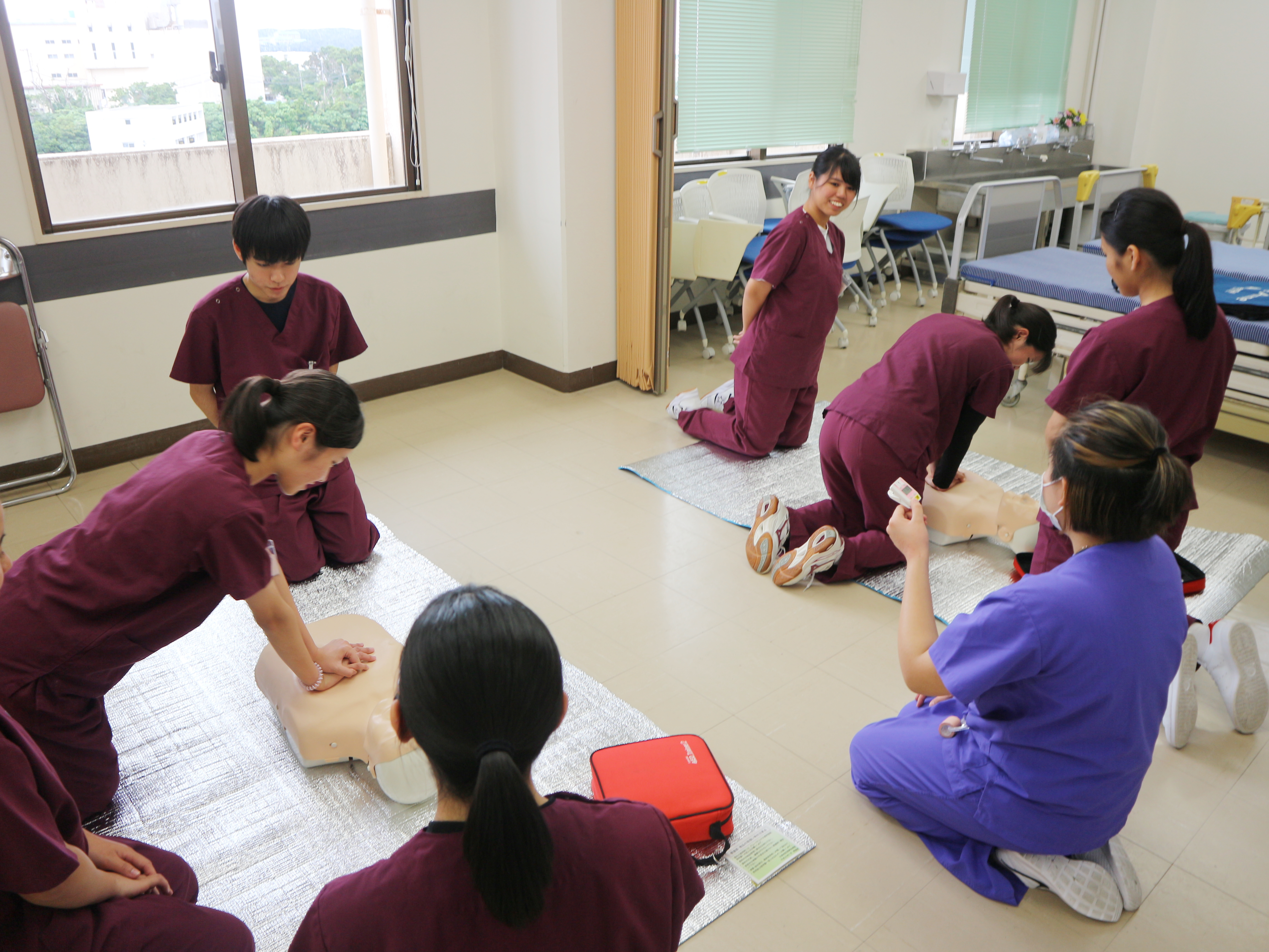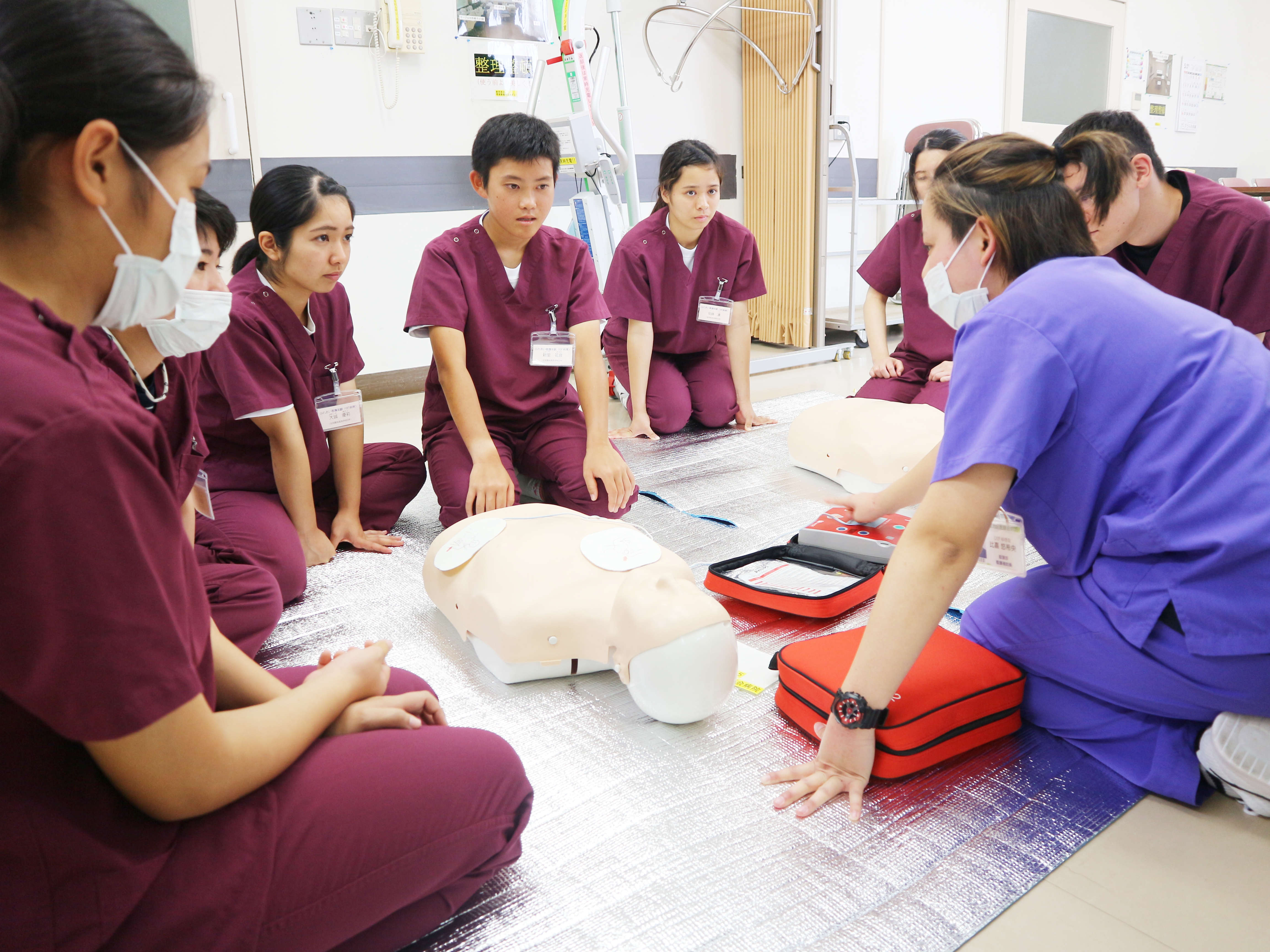 午後からは血圧測定・スライダーを使用した患者移動・手洗い法・AEDを使用した救急蘇生法(BLS)を体験してもらいました。