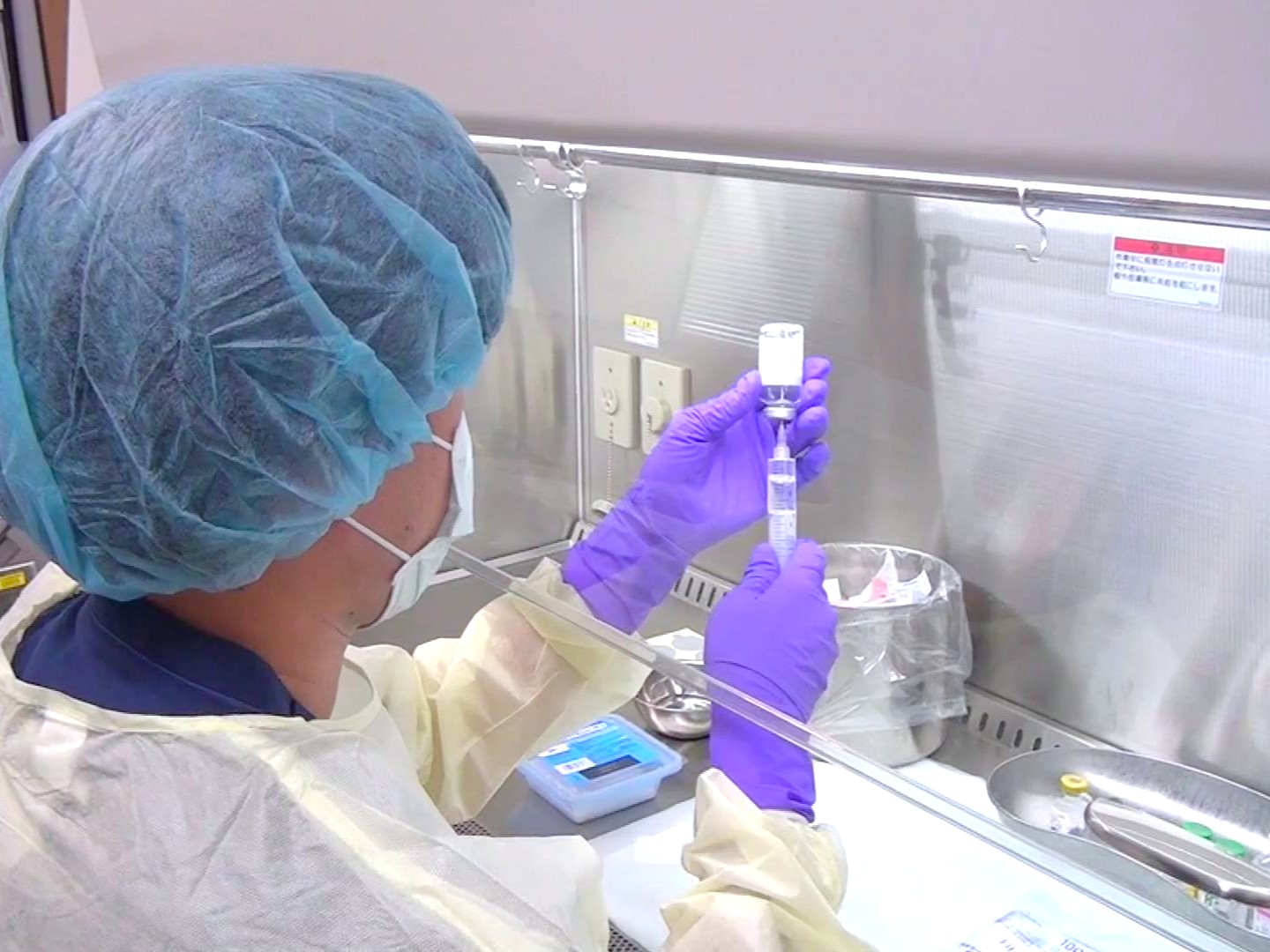 薬剤師は、医師が抗がん剤のオーダーを出す際、「投与量」「休薬期間」などのチェックを行っています。調製は、原則すべて薬剤師が安全キャビネット内で無菌操作を行っています。